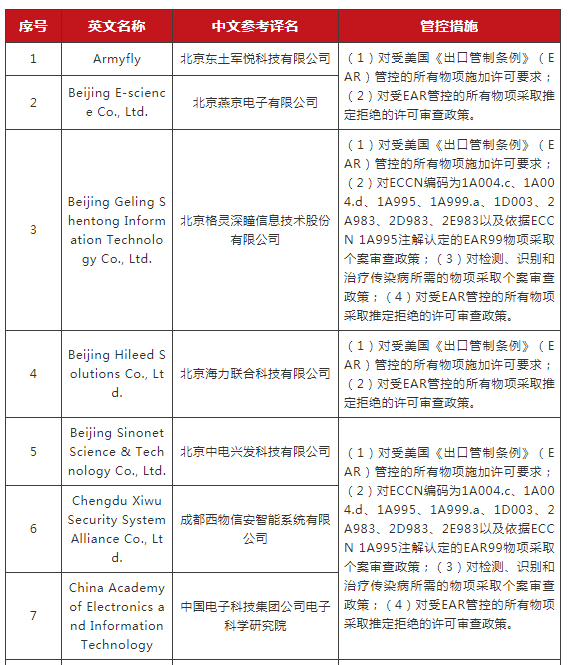 ERC認(rèn)定以下實(shí)體與所謂“中國在新疆的侵犯人權(quán)行動”有牽連,違反美國外交政策,將其列入“實(shí)體清單”。