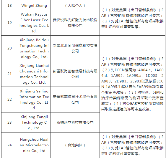 就在這個月的7月12日,美國商務(wù)部產(chǎn)業(yè)與安全局(BIS)通過《聯(lián)邦政府公報》(Federal Register)發(fā)布了一項(xiàng)最終規(guī)則(final rule),來自中國的24個實(shí)體/個人從事或促成了有違美國國家安全或外交政策利益的活動,因而將其列入“實(shí)體清單”。被列入清單的理由、列入后的許可要求和許可審查政策如下。