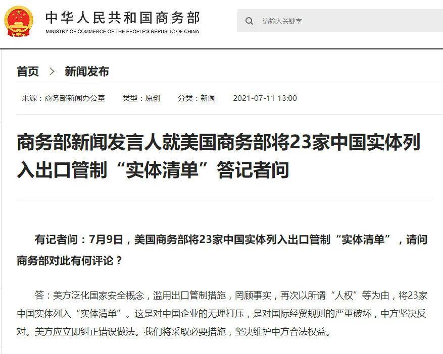 7月9日,商務(wù)部新聞發(fā)言人就美國商務(wù)部將23家中國實(shí)體列入出口管制“實(shí)體清單”答記者問:美方泛化國家安全概念,濫用出口管制措施,罔顧事實(shí),再次以所謂“人權(quán)”等為由,將23家中國實(shí)體列入“實(shí)體清單”。這是對中國企業(yè)的無理打壓,是對國際經(jīng)貿(mào)規(guī)則的嚴(yán)重破壞,中方堅決反對。美方應(yīng)立即糾正錯誤做法。我們將采取必要措施,堅決維護(hù)中方合法權(quán)益。